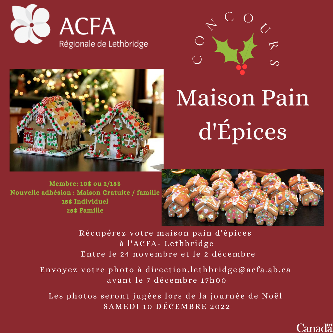 Cette année, l'ACFA Lethbridge revient avec son concours de Maison Pain d'épices pour une 2e année consécutive. Les plus belles Maisons Pain d'épices seront jugées lors de la Journée de Noël, qui aura lieu le Samedi 10 décembre. Nous vous invitons à vous inscrire et venir chercher votre Maison Pain d'épices au bureau de l'ACFA, […]