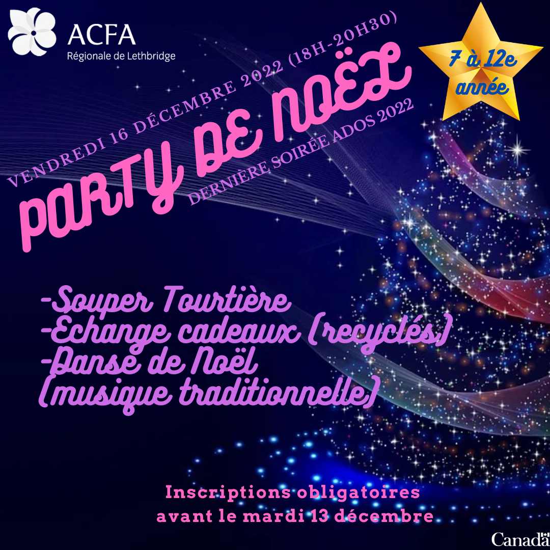 Gratuit pour les 7e année à 12e année Contactez-nous au 403-328-8506 Courriel: soireesados@acfa.ab.ca Soirée Ados: Party de Noël -Souper tourtière -Échange cadeaux recyclés -Danse de Noël avec musique traditionnelle (Inscription obligatoire avant le 13 décembre)